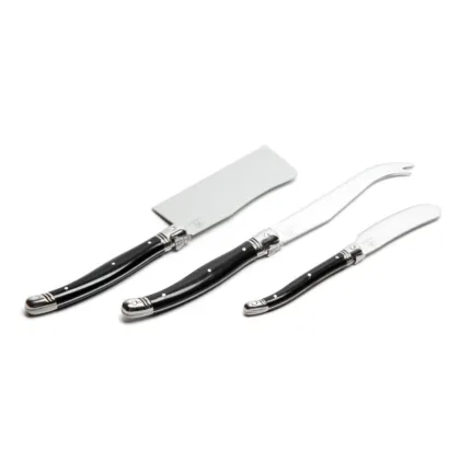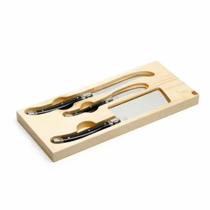 Set de queso de diseño francés con 3 utensillos de distintos tamaños. Los mismos vienen en una cuna de madera. Packaging: caja rígida de cartón laminada, la cual posee una ventana de cristal PVC. Medidas de la caja: 31 x 16 x 6 cm. Producto libre de BPA. Laguiole.