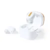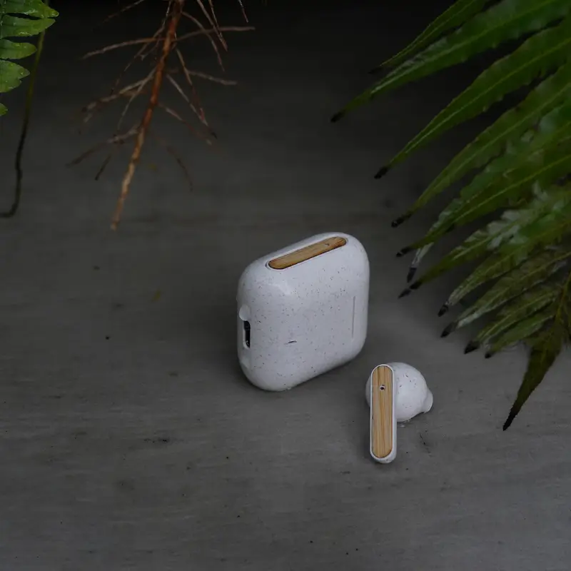 Auriculares inalámbricos fabricados en bambú, ABS y Wheat Straw, pasta de tallo de trigo, un material sustentable que reduce el consumo de plásticos vírgenes. Cada auricular cuenta con un botón touch que permite: contestar y finalizar llamadas, reproducir y pausar música, cambiar a la siguiente o anterior canción, subir y bajar el volumen y acceder al asistente de voz. Tienen tecnología Bluetooth 5.3, una duración de batería de aproximadamente 3.5 horas y un estuche de carga de 200 mAh, el cual se carga a través de un cable usb c. Los auriculares vienen dentro de una caja de cartón junto a su manual de instrucciones y cable cargador.