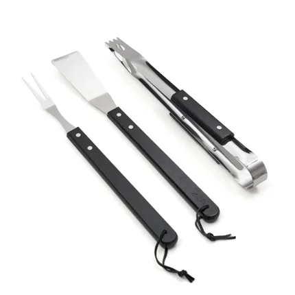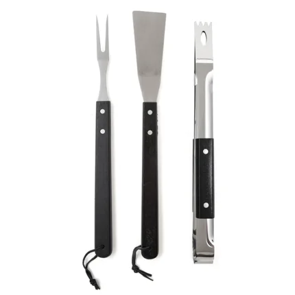 Set para barbacoa de madera y acero inoxidable. Incluye tenedor, pinza y espátula. Cuenta con bolsa con cierre ajustable. Medidas: 40 x 15 cm.