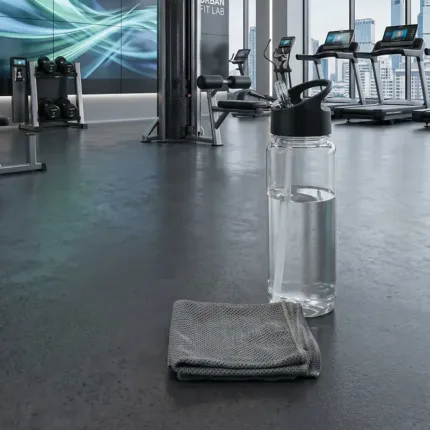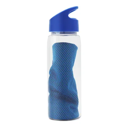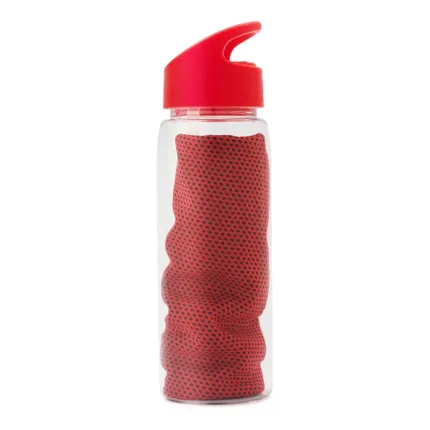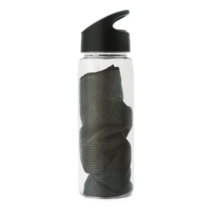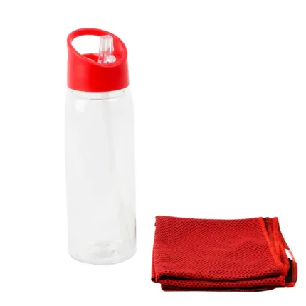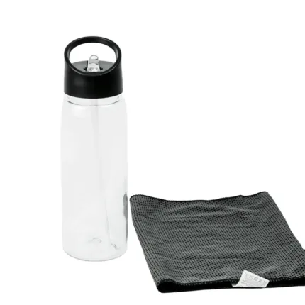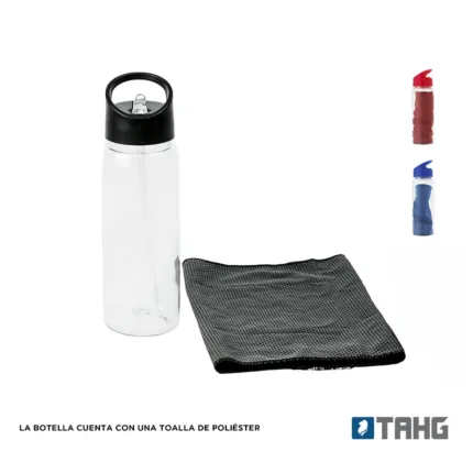 Botella deportiva fabricada en RPET con tapa de polipropileno. Cuenta con una toalla de poliéster de 18 x 79cm, tapa con sorbete y anillo para mejor agarre. Es ideal para entrenamientos, actividades al aire libre o jornadas deportivas intensas