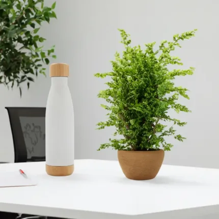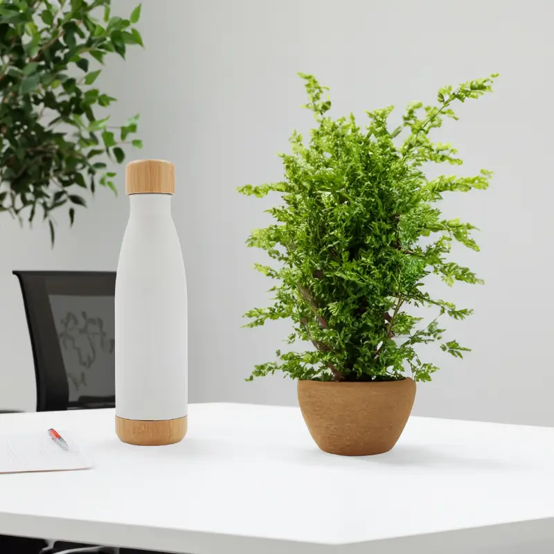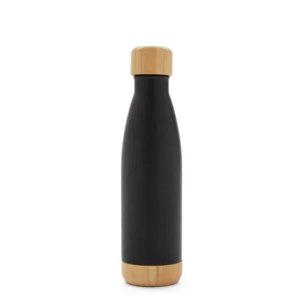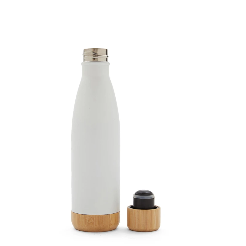 Botella térmica de doble pared de acero inoxidable y tapa de bambú con capacidad de 500 ml. Mantiene las bebidas frías por 24 horas y calientes durante 12 horas. Ideal para deporte o uso diario.