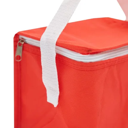 Realizado en Friselina (NON WOVEN). Interior en aluminio y PE Foam 2mm. Tiras para sujetar. Compartimiento principal superior.