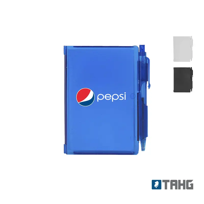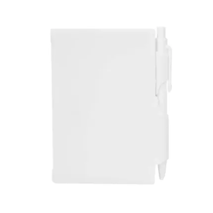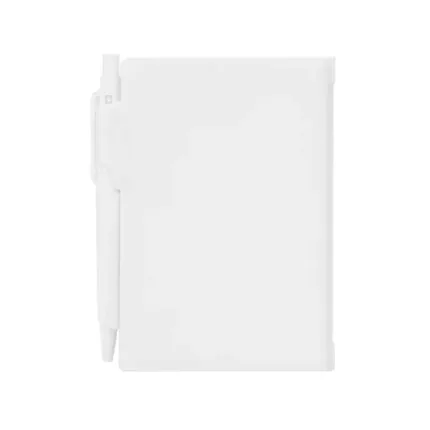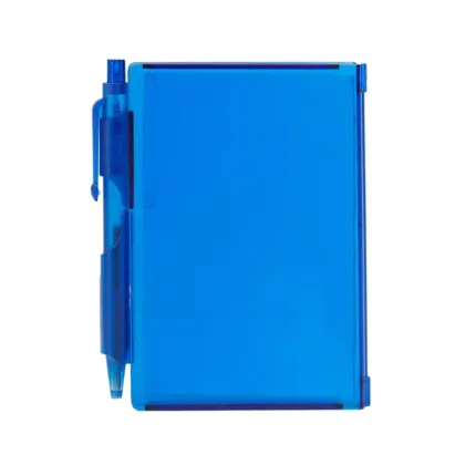 Cuaderno Plástico con tapa dura de PS y porta bolígrafo. 80 hojas lisas. Incluye bolígrafo. Medidas: 10,4 x 7,8 cm.