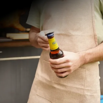 El delantal de ReUseMe está confeccionado en tela de Jute laminada con TNT, tela no tejida. Cuenta con dos tiras para atar en la cintura y un bolsillo frontal.