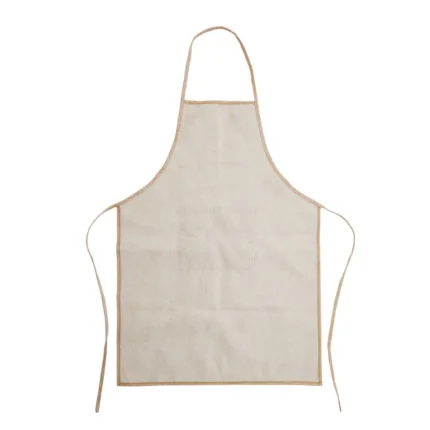 El delantal de ReUseMe está confeccionado en tela de Jute laminada con TNT, tela no tejida. Cuenta con dos tiras regulables para atar en la cintura y un bolsillo frontal.