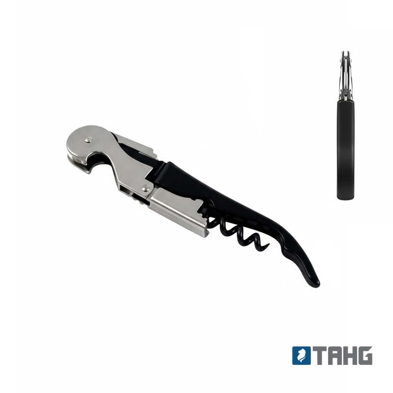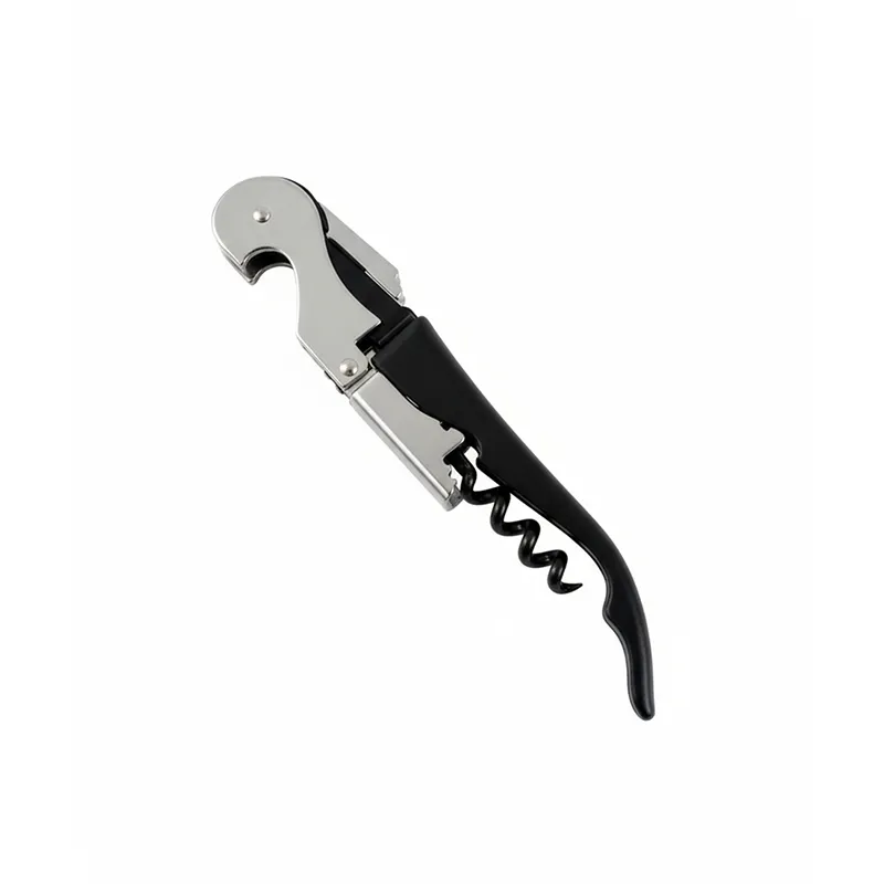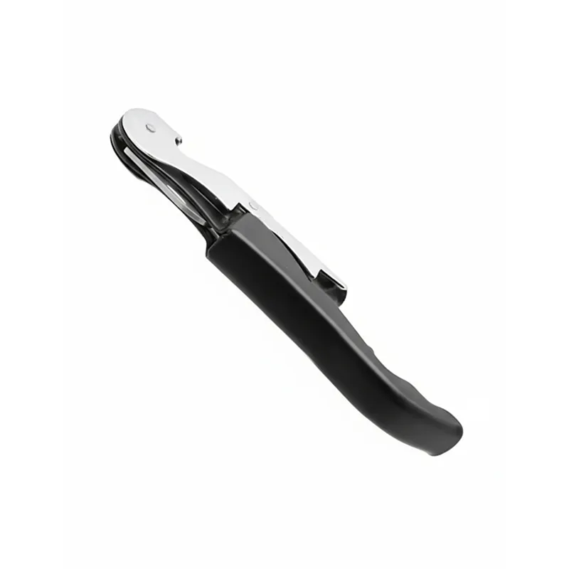 Destapador metálico tipo sacacorchos con diseño ergonómico. Fabricado en acero inoxidable combinado con acero al carbono, lo que garantiza resistencia y durabilidad incluso en uso frecuente. Cuenta con sistema de palanca doble, abridor de botellas y navaja, todo en un solo cuerpo compacto. Es ideal para uso en restaurantes, bares, eventos o para quienes buscan un accesorio práctico y profesional para abrir vinos y cervezas con facilidad.