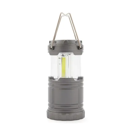 Linterna retráctil de tamaño compacto, fabricada en ABS de color gris. Funciona con 3 pilas AAA (incluidas). Ideal para camping y aventuras al aire libre. Dimensiones: 6,85 x 9,5 cm.