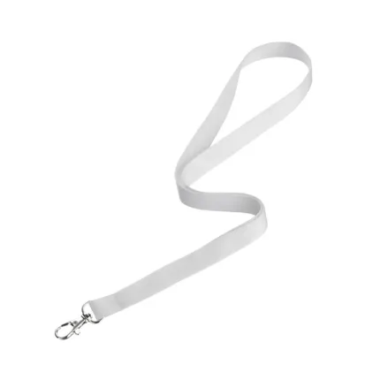 Cinta porta credencial blanca de poliéster con gancho metálico, fabricada en poliéster y aleación de zinc. Cuenta con doble mosquetón metálico resistente que asegura credenciales e identificaciones de manera práctica y segura. Es ideal para empresas, instituciones educativas, ferias, congresos y todo tipo de eventos donde se requiera portar identificación visible.
