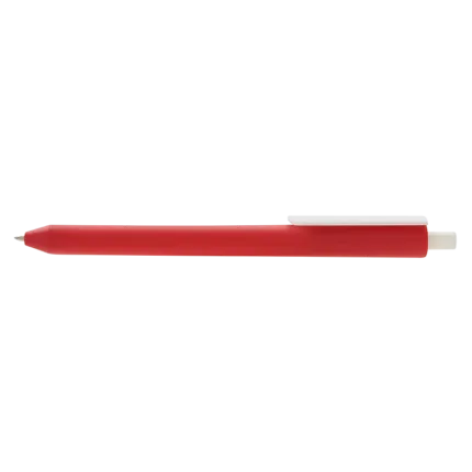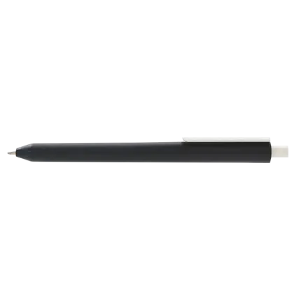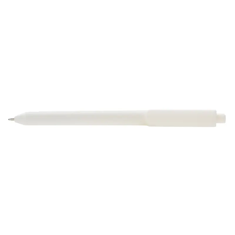 Lápiz confeccionado en ABS, con clip en color blanco. Apertura con pulsador retractil. Tinta azul.