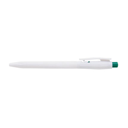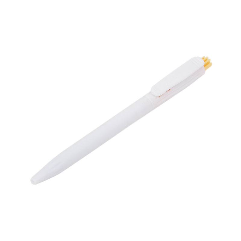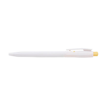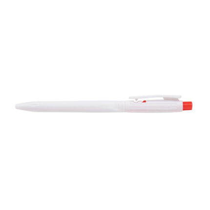 Lápiz confeccionado en ABS, de cuerpo de color blanco y clip en color. Apertura con pulsador. Tinta Azul
