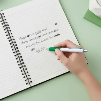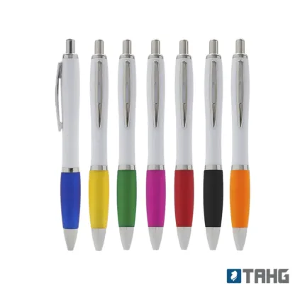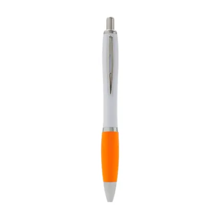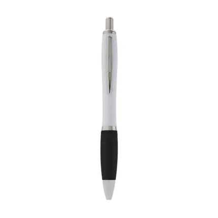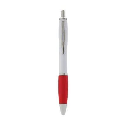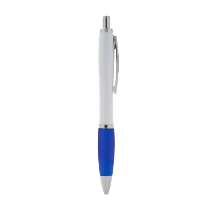Bolígrafo con cuerpo curvo plástico en acabado blanco. Cuenta con grip de goma de color, clip y botón metálico, mecanismo retráctil y tinta azul.