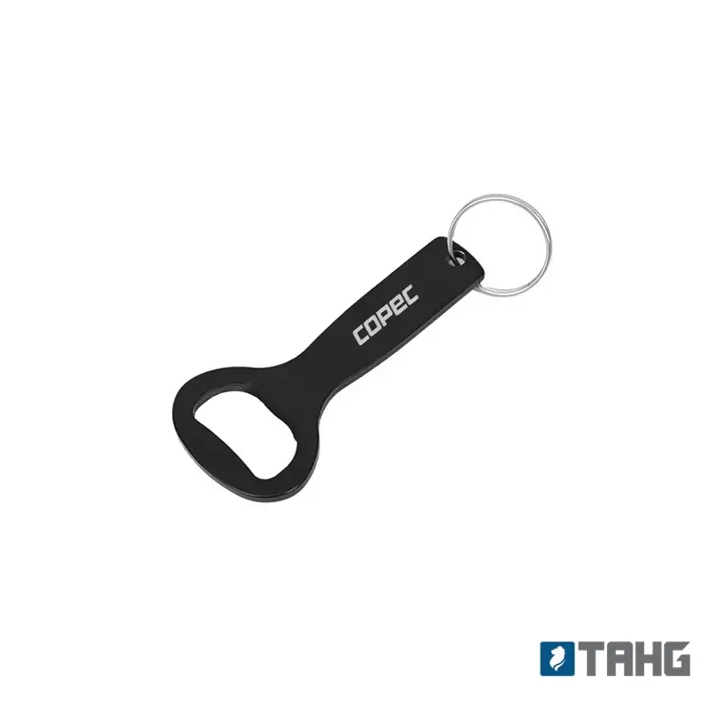 Llavero con destapador de aluminio. Medidas: 8,3 x 3,9 cm.