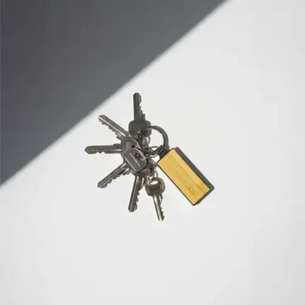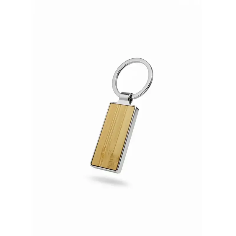 Llavero metálico con cara de bambú. Fabricado en aleación de zinc y bambú en color natural. Cuenta con anilla duradera y diseño alargado minimalista. Es ideal para merchandising ecológico, campañas publicitarias y uso diario.