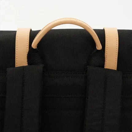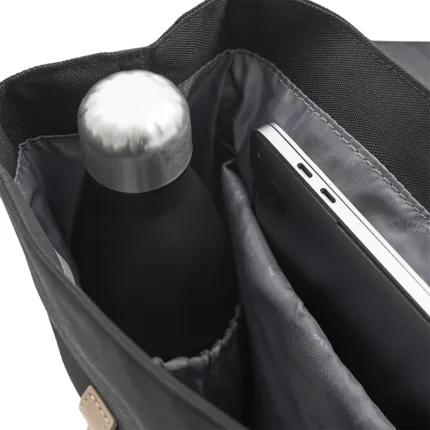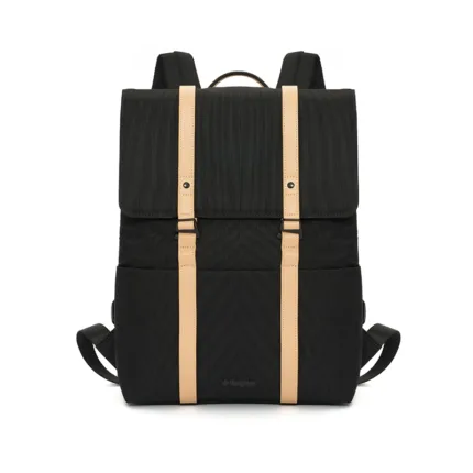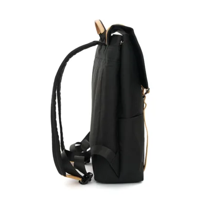 Mochila tipo urbana con solapa y broches metálicos, confeccionada en poliéster reciclado 600D. Cuenta con compartimiento principal bajo solapa, broches metálicos al frente, tiras ajustables y bolsillo interior. Incluye manija superior, diseño estructurado y costuras reforzadas que aportan durabilidad.