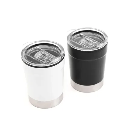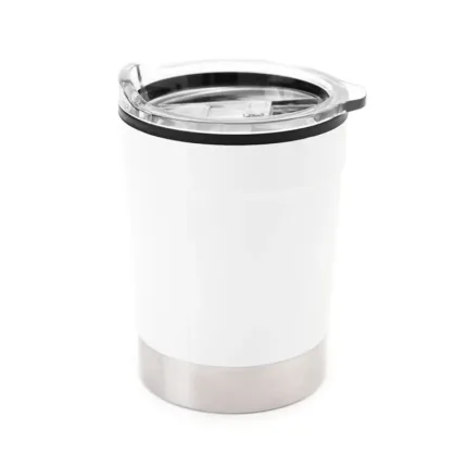 Mug térmico realizado en acero inoxidable en su exterior, y polipropileno de color negro en su interior, con tapa transparente cristal clear con cierre. Producto libre de BPA. Interior realizado en plástico. Medidas: 12 cm x Diámetro 8.5 cm. Capacidad: 360 ml