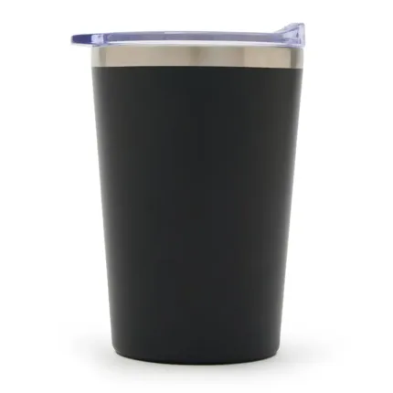 Mug fabricado en acero inoxidable color negro, con tapa antiderrame de acrilonitrilo estireno, garantizando resistencia y durabilidad.