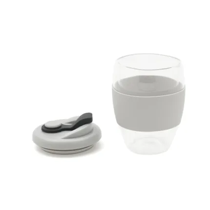 Mug reutilizable confeccionado en vidrio de doble pared de borosilicato. Gracias a su doble pared, no transmite el calor de la bebida a la manos. Cuenta con tapa con boquilla con cierre a presión y banda de silicona gris antideslizante personalizable. Capacidad: 350 ml. Medidas: 14,5 x 8,5 (Altura x Diámetro). Incluye Gift Box confeccionada en cartulina Kraft.