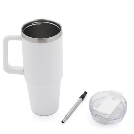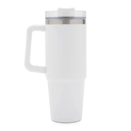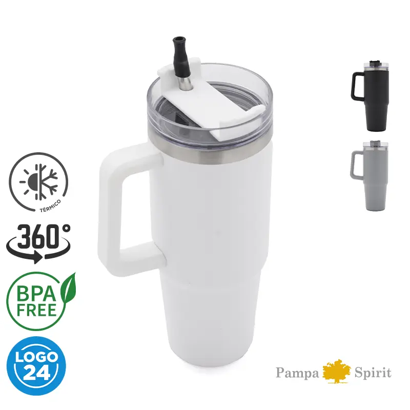 Mug de doble pared con capacidad de 30 oz (887ml). Está confeccionado en acero inoxidable 304 en su interior, y su exterior en acero inoxidable esmaltado. Tapa realizada en ABS y PP, con sorbete incluido de acero inoxidable y silicona.