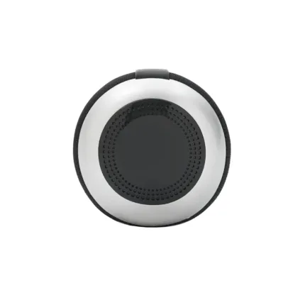 Parlante portátil Bluetooth de color negro con detalles en gris. Cuenta con una correa de agarre y una base que proporciona un mejor apoyo y estabilidad al usarlo en diversas superficies.