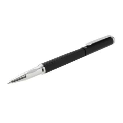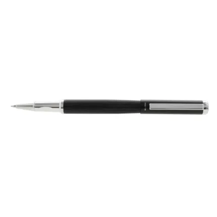 Lapiz roller de cuerpo metálico en acero con detalles en negro. Cuenta con tinta azul. Medidas: 13,8 x 1,3 cm.