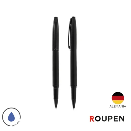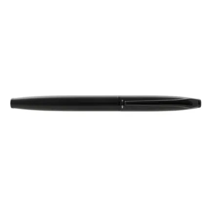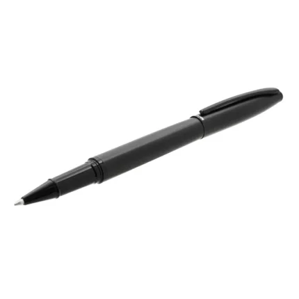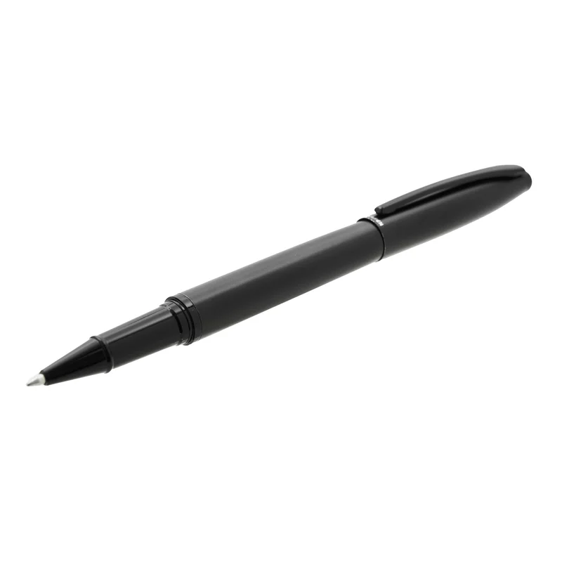 Lapiz roller de cuerpo metálico en acero con detalles en negro mate. Cuenta con tinta azul. Medidas: 13,6 x 1,25 cm.