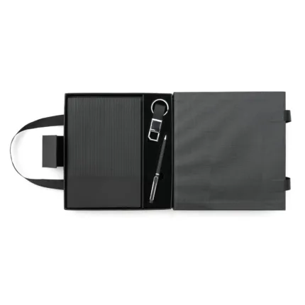 Elegante set que incluye un cuaderno A5 rayado (80 g, 100 hojas, 21 x 14 cm), un lapiz de tinta azul y un llavero, todo presentado en una caja negra mate con correas para transportar fácilmente. Es un producto ideal para regalar en eventos corporativos o fechas especiales.