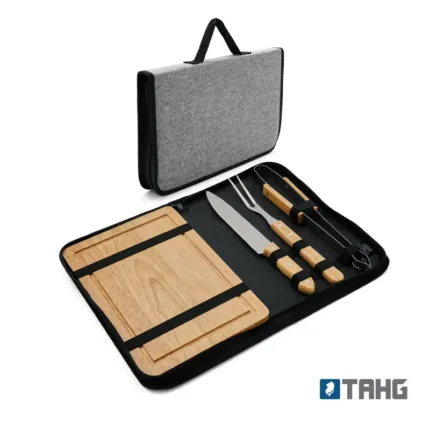 El Set BBQ Brasa es ideal para tus parrilladas y asados. Contiene: 1 tabla, 1 cuchillo, 1 tenedor y 1 pinza. Viene presentado en un estuche de poliéster de alta calidad, perfecto para almacenar y transportar tus utensilios. Tahg