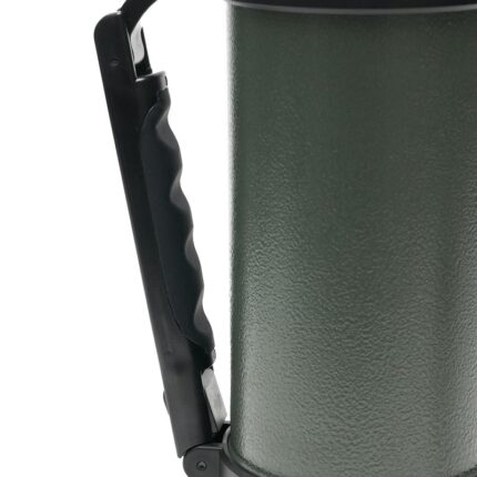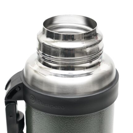Termo de acero inoxidable 304, recubierto con esmalte especial que protege de ralladuras y golpes. Puede mantener el contenido a la misma temperatura durante 18hs, gracias a su doble pared aislante especial de acero. Cuenta con un tapón cebador Hermético a rosca con la función anti derrame y tapa con superficie plana estable para usar como taza o vaso y manija plegable para facilitar el transporte. Presentado en caja de cartón. Medidas del termo: 34 cm x 10,5 cm. Medidas de la caja: 35 x 11 x 11 cm. Capacidad: 1,1 Lts.